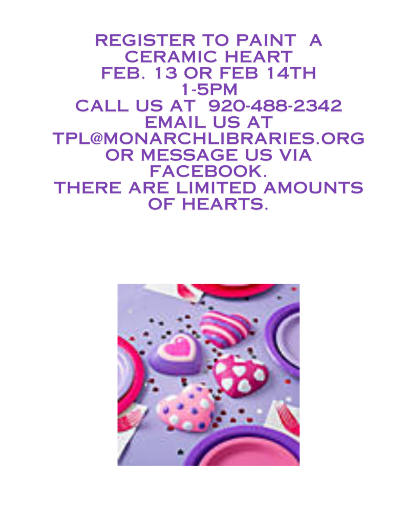 Check Out items, use the digital collection, participate in a Program at the library and you can enter a Raffle for a Prize. Put your Raffle ticket in the can of the Prize you would like to WIN! Prizes include Lego Orchid, Monarch Library System Fleece Jacket, Gift Card to Confection for Any Occasion. Hope to See you During the month of February.