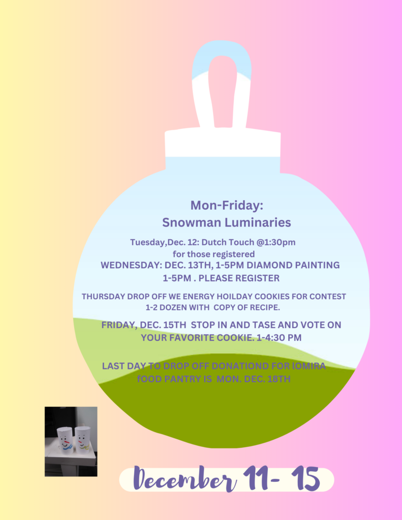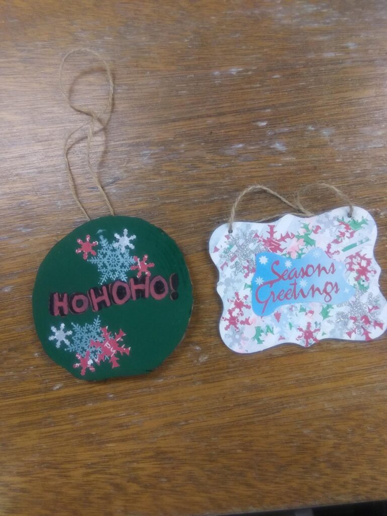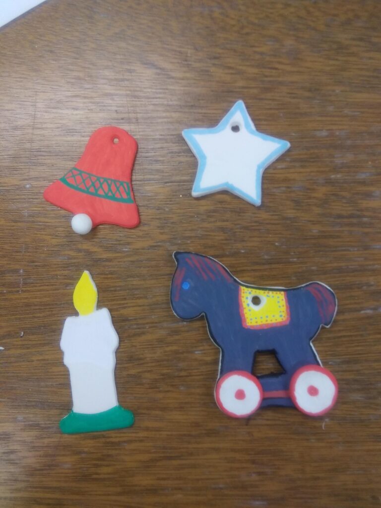 We will have supplies out for you to create a wooden Ornament. We will also have Soft air dry clay out and cookies cutters out to create ornaments for all.