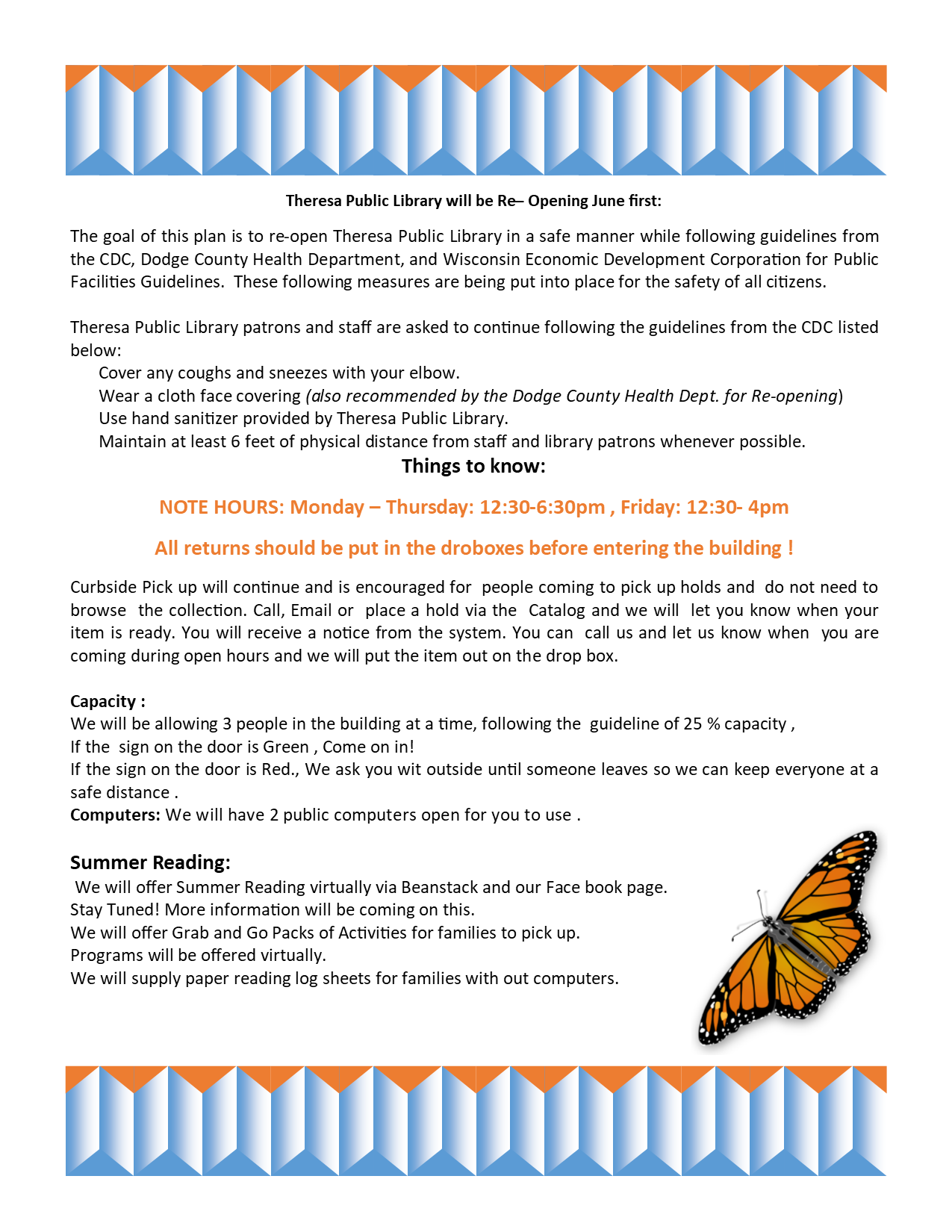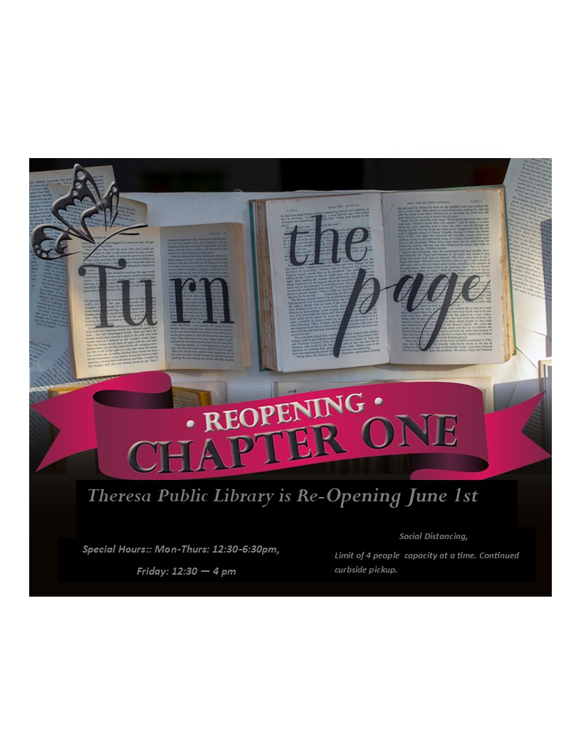 Theresa Public Library remains firmly committed to protecting the health and safety of library visitors, staff, and our wider community.